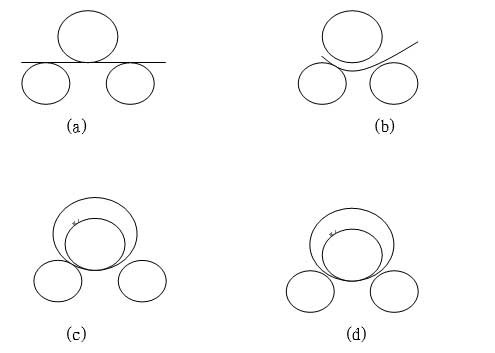 該機(jī)結(jié)構(gòu)形式為三輥對稱式。上輥在兩下輥中間對稱位置作垂直升降運動,通過蝸輪、蝸桿而獲得,兩下輥作旋轉(zhuǎn)運動,通過減速機(jī)的輸出齒輪與下輥齒輪嚙合,實現(xiàn)板材的行走。當(dāng)上輥的下壓力超過材料的屈服限度時,便使所卷制的材料變形,變形過程如下圖: